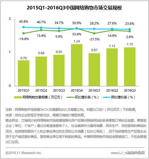 根据调查统计分析表明,从2006至2011年中国网购市场交易规模增速是非常高的,到2011年至2014年期间也基本保持50%左右,但自2015年以来,增速开始逐季度下降。2016年中国网购市场交易规模增长速度继续保持逐季度下降趋势,根据艾瑞咨询统计,2016年前三季度中国网络购物市场交易规模增长速度分别为28.2%、27.6%、23.6%,据此预测,我们认为2016年中国网购交易规模将达到4.74万亿左右,比上年增长24%,在网购市场交易规模大幅下降的趋势下,中国商贸领域也正式开始了全渠道流通变革,开始进入新零售革命新阶段。全渠道的新零售变革最突出的就是商品销售从网购市场和传统批发零售市场两个渠道,向社区网购、微商购物、产品生产企业自身的B2C网购等多渠道全面发展。根据中国仓储与配送协会王继祥副会长估计,目前中国电子商务零售领域,网购市场之外的其他渠道的电子商务交易规模增长速度至少在300%以上,市场规模达到了1.5万亿以上。